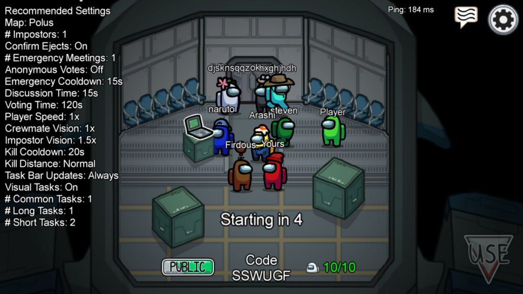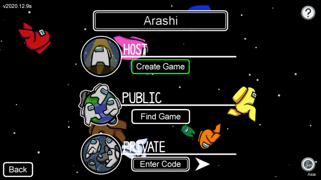 ホストはゲームマップ、人数、インポスター(人狼)人数、チャット言語を選択します。