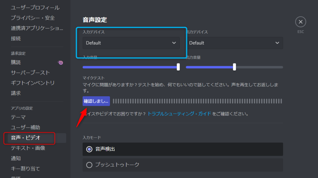自分の声を拾う装置です。ここが間違っていると、どれだけ調整しても声は届きません。出力デバイス(スピーカー・ヘッドホン)