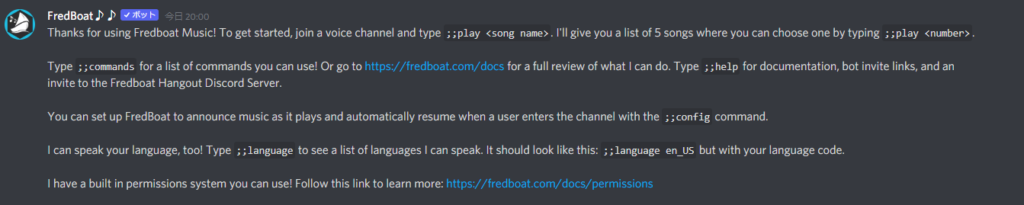 また、 ;;commands と入力すると、使用できるコマンドのリストが表示されます。また、https://fredboat.com/docs に行けば、私ができることの全容がわかります。help と入力すると、ドキュメント、ボット招待リンク、Fredboat Hangout Discordサーバへの招待が表示されます。