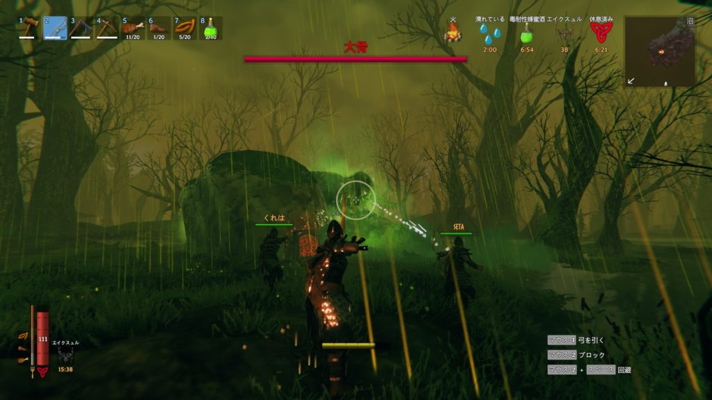 特に毒の継続ダメージがエグいので、ハチミツから作成できる蜂蜜酒の毒耐性を持っていきましょう。