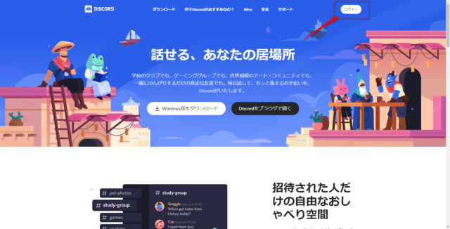 ブラウザ公式サイトでDiscordのログイン画面を開きます。
