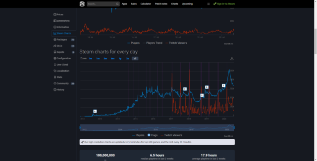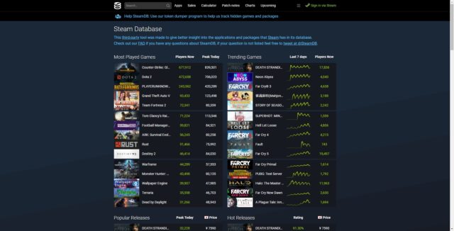 最安値とは関係ありませんが、SDBではその名の通りスチームの大体のデータを見ることができます。