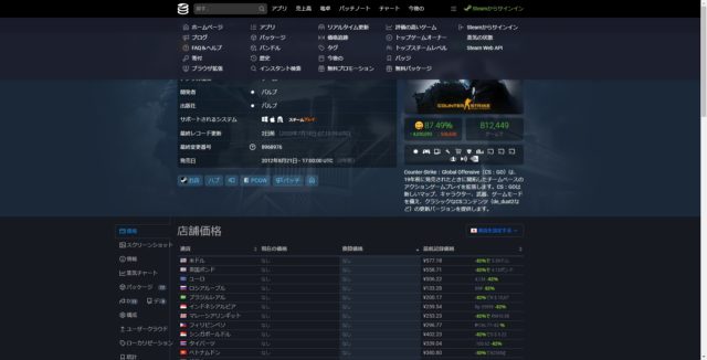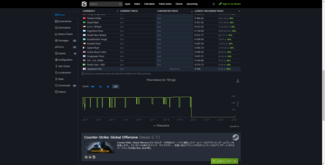 最安値だけを調べたい場合や、上のSDBの情報量が多すぎて分かりづらい場合には、SteamSaleを活用するといいでしょう。