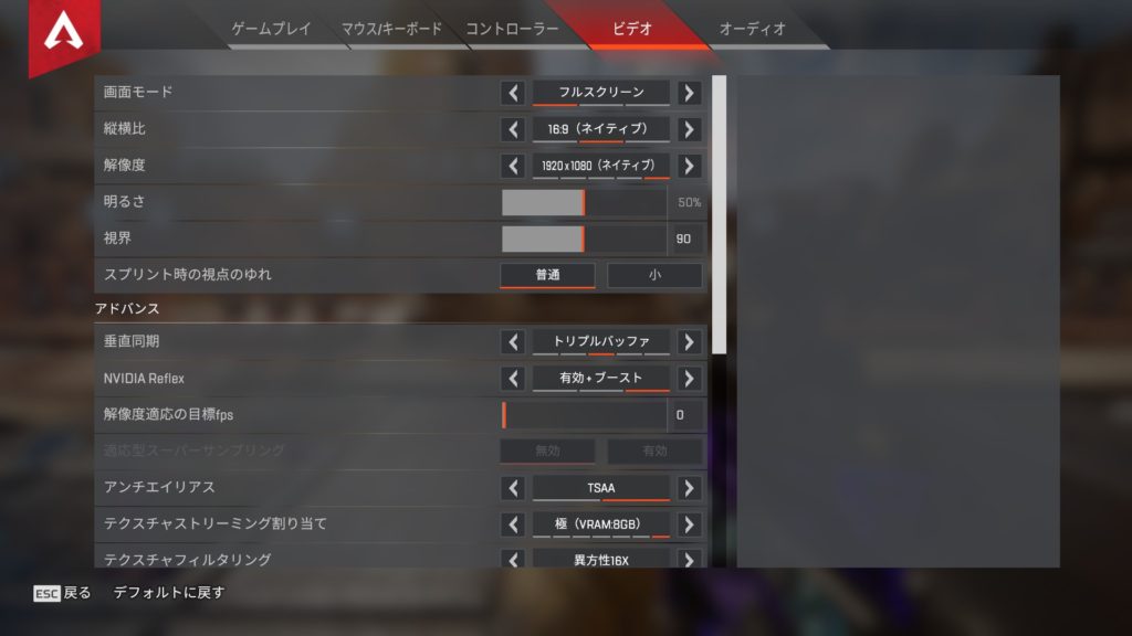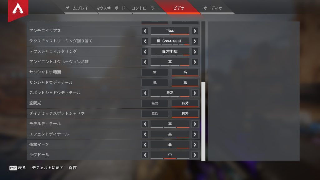 ApexLegends側のビデオ設定