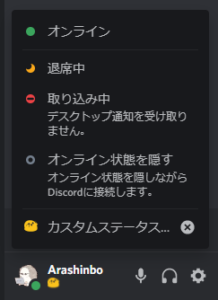 | PC | 左下のユーザーエリア | 自分のアイコンをクリック → ステータス選択 | オンライン状態を隠す |