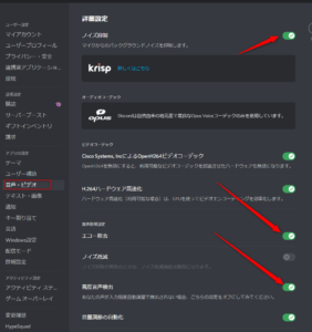 Discordアプリ側の音声設定(ノイズ抑制など)を見直す