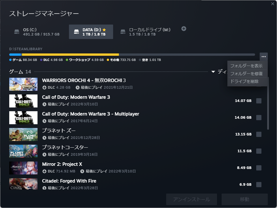 ライブラリフォルダ:Steamが「この場所にゲームを入れる」と管理する単位