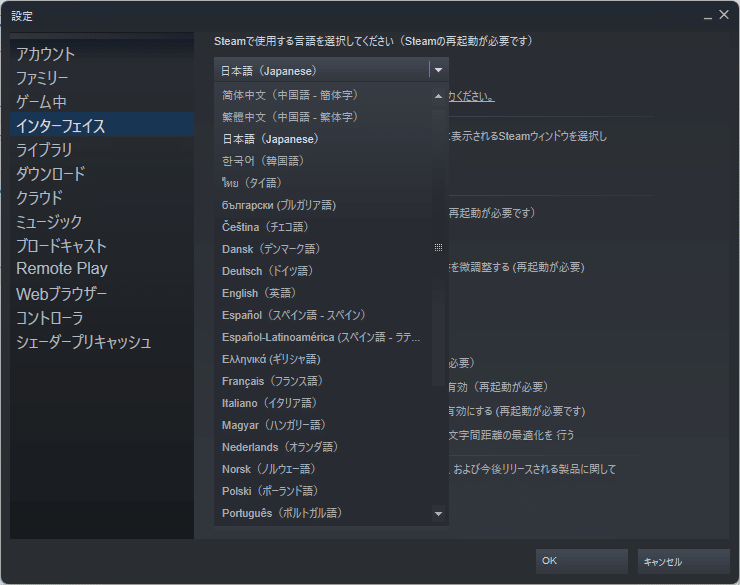 Steamクライアントの言語が「Settings → Interface」で日本語に固定されているか確認する
