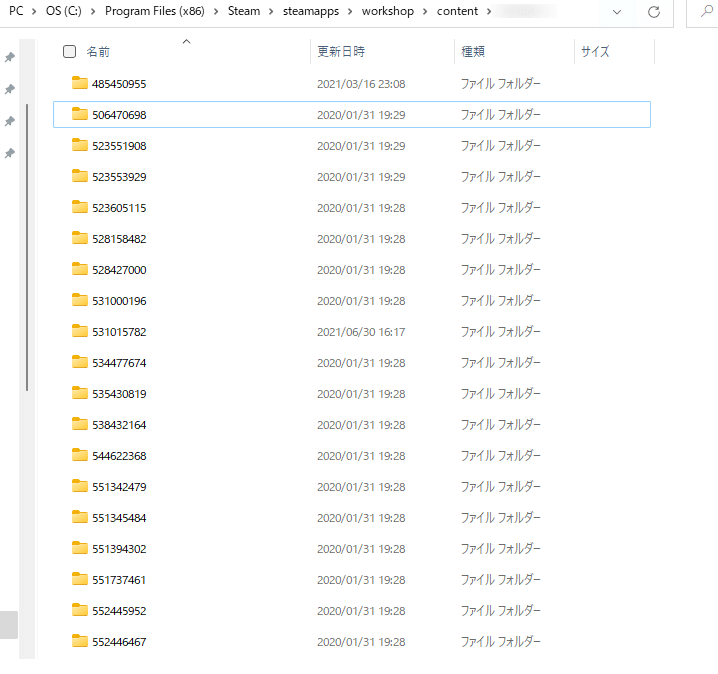 対象のゲームID/ワークショップIDのフォルダを特定します。