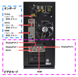 上部はマザーボードといってCPUで出力され、下部はGPUで出力されています。