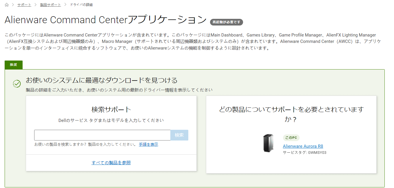 ドライバの詳細で自動的に自分がAlienwareのパソコンを使用している場合は検索をかけてくれます。
