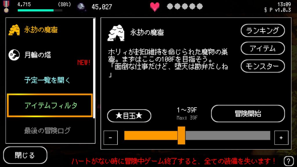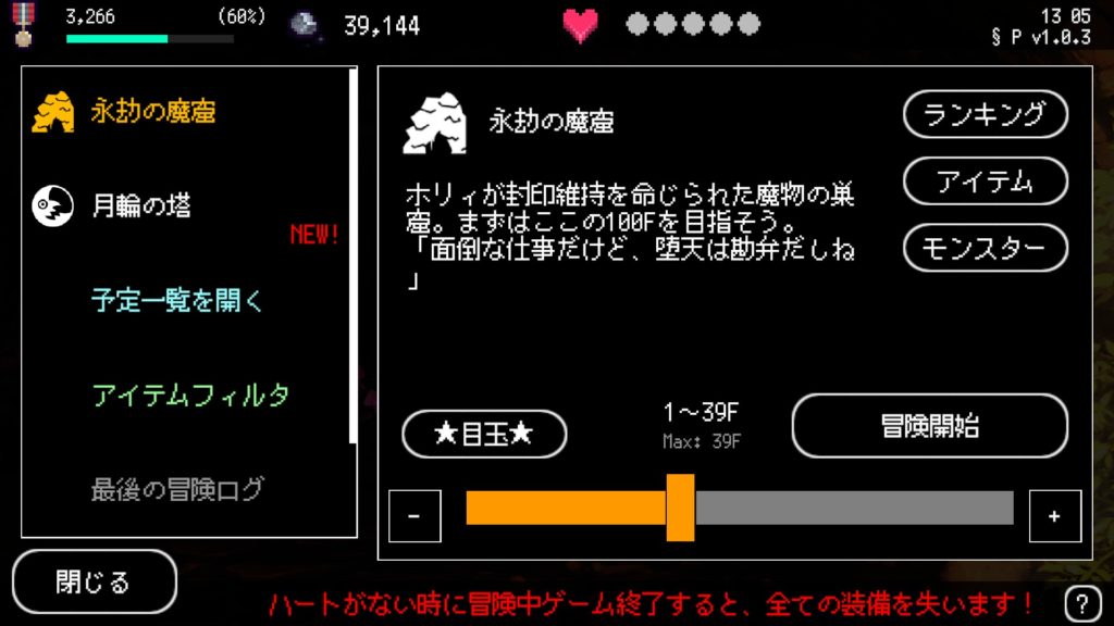 今回は30のボスを討伐できているので39で冒険を開始します。