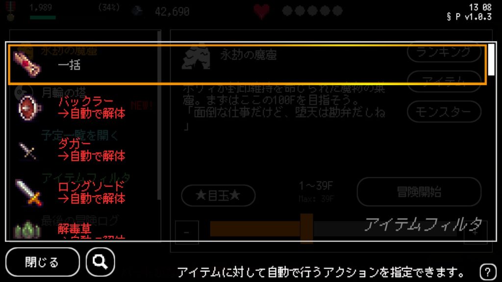 B100X Auto Dungeon RPG後半はアイテムフィルターを使用しよう