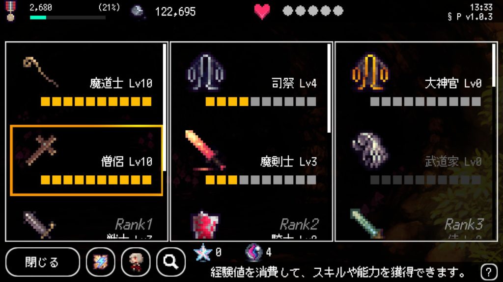 B100X Auto Dungeon RPGではジョブがあり、レベルを上げることで上位職やスキルを覚えることが出来ます。