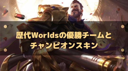 LoL(League of Legends)のWorldsの歴代優勝チームとWorldチャンピオンスキンを紹介します。 優勝したチームのプレイヤーが選んだチャンピオンスキンをそれぞれまとめています。 ※本コンテンツは「記事制作ポリシー」に基づき、正確 […]