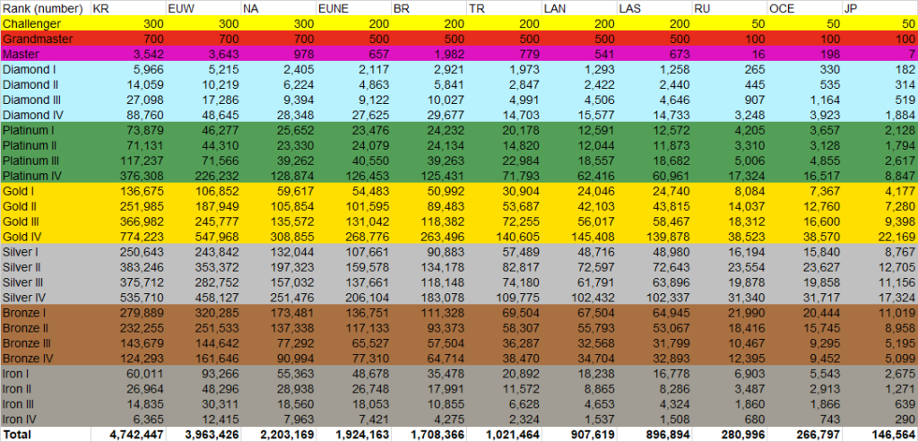 正確なデータをLoLの運営であるRiotは公開していませんがOPGGなどのプレイヤーデータを行うサイトなどで確認できている情報になります。