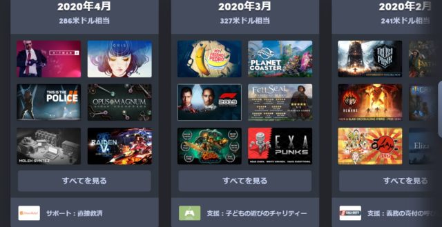 注目すべきは下のサポートです。humbleではbundleの購入の際に非営利団体などに購入金額の何%かを寄付しています。なので、ゲームを買いながら社会の役に立つことができます。