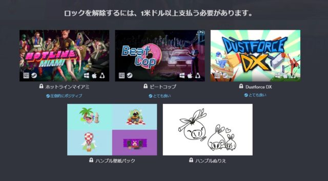 HumbleChoiceは月に1度ですが、bundleも販売されています。多くは1ドルから購入できます。サイトの左上から現在のバンドル提供状況を見ることができます。
