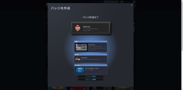 バッジが完成しました。 トレーディングカードのバッジは確定で100経験値を獲得します。 バッジのレベルは5が最大でトレーディングカードをもう一度集めることで、一つのバッジに付きレベル5(経験値500)まで獲得可能です。