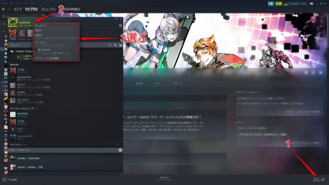 ゲームをしていることを隠したい場合は、オフラインにしておくと便利です。