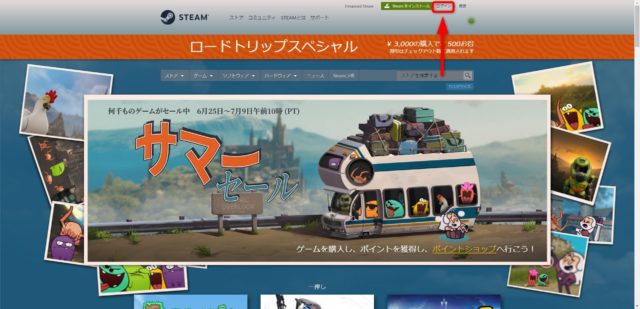 今回はサマーセールの開催中なので通常画面とは異なりますが、セール時以外にもログインの位置は同じです。