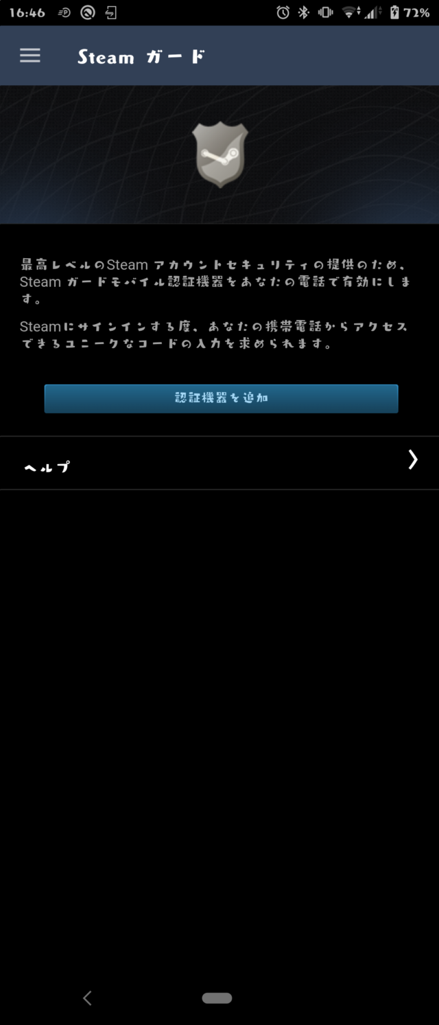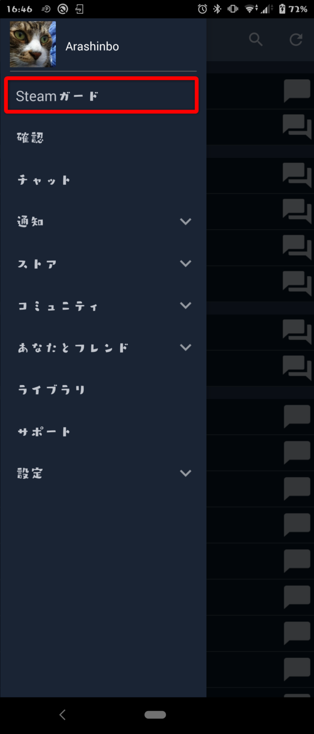 Steamアプリメニューの一番上にあるSTEAMガードから二段階認証を設定することができます。