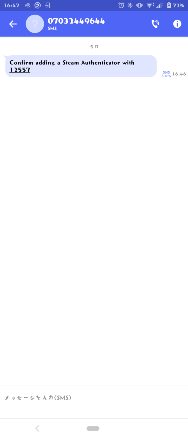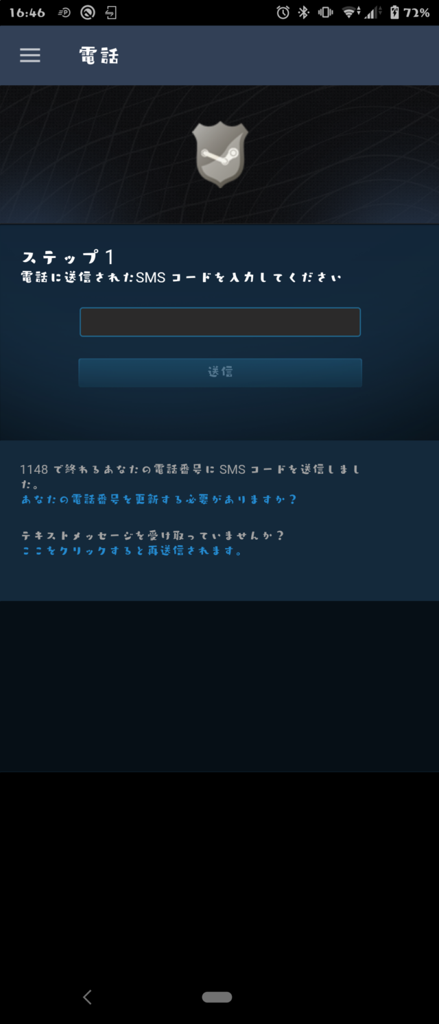 STEAMに登録されている電話番号に認証コードが送信されますのでコードを入力します。