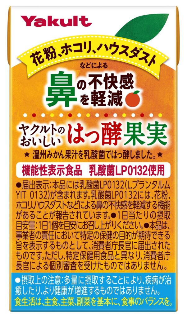 ヤクルト公式の商品情報では、本商品が機能性表示食品であり、届出番号がH386であること、関与成分が乳酸菌LP0132であること、そして「花粉、ホコリ、ハウスダストなどによる鼻の不快感を軽減する機能があることが報告されている」といった届出表示が示されています。